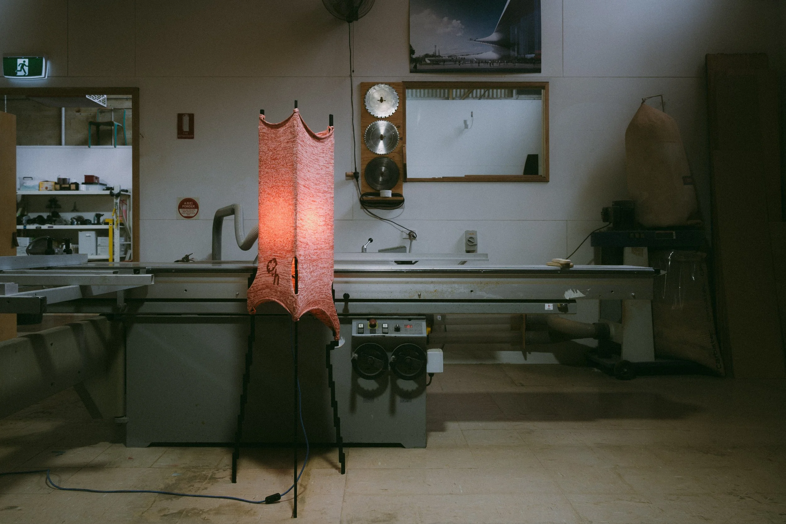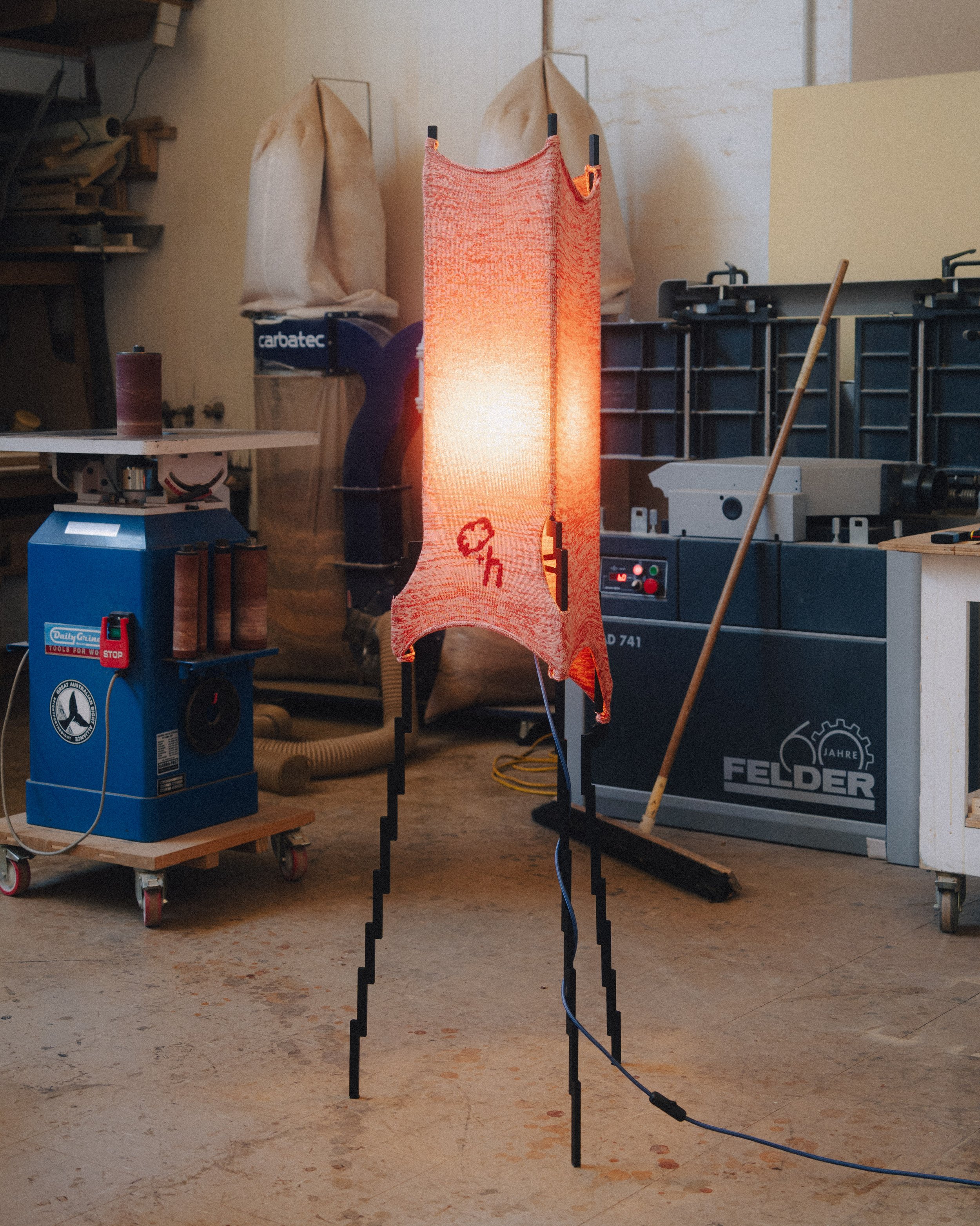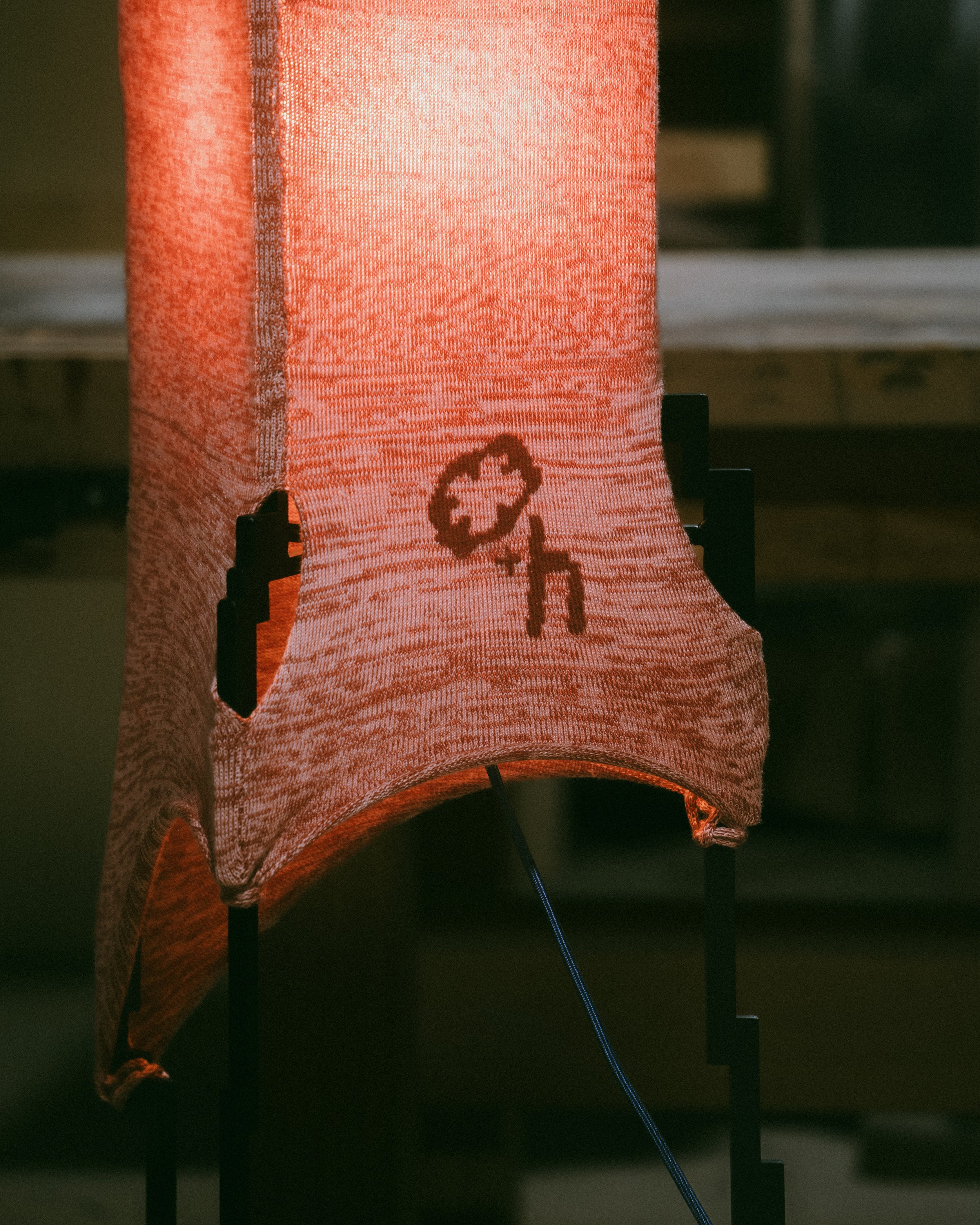 The Glitch lamp is an exploration of this quality in knitwear. The frame design, emblematic of a pixelated knit thread, serves both as a lens to capture the resolution and fidelity of a glitch, and as a frame for stretched knit fabric.